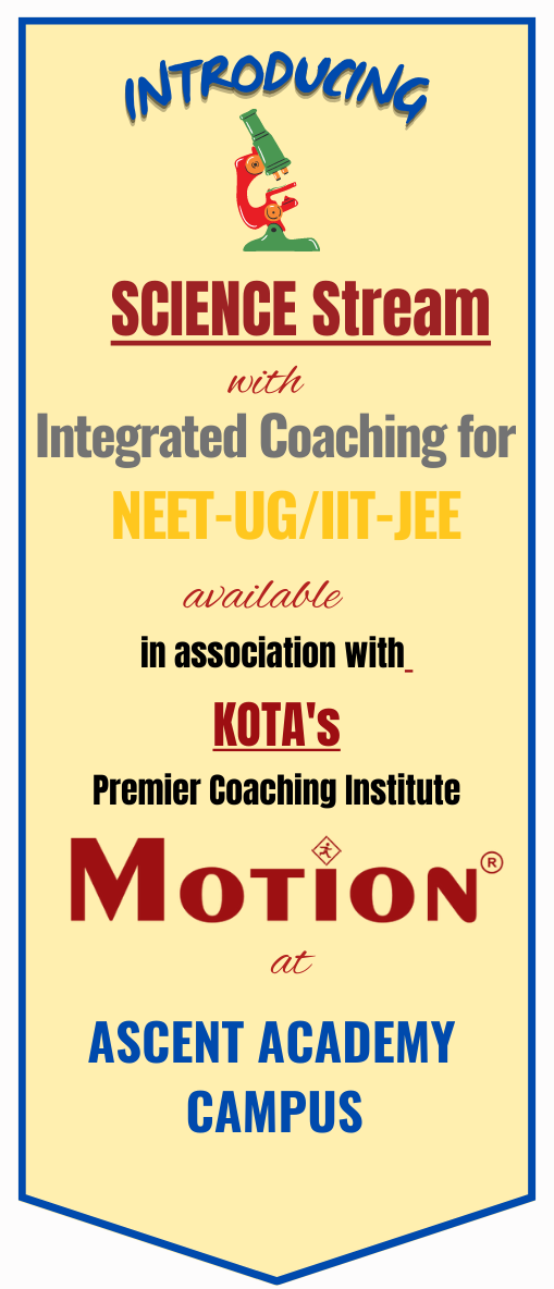 Taking advantage of MOTION's presence in our very own Campus itself,Ascent Academy Senior Secondary School also seeks to associate withMOTION Guwahati Center actively and extend KOTA's expertise, excellence of content and delivery in the area of Science Education and Coaching to the students our School.